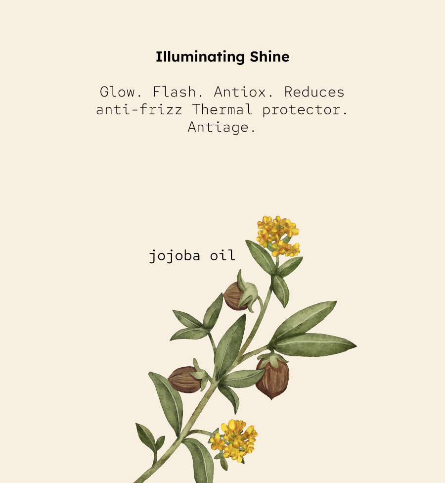 Enhance your hair’s radiance with Illuminating Shine, a lightweight spray that boosts shine and seals the cuticle for a silky, luminous finish. Powered by Jojoba oil and also enriched with Argan, Coconut, and Macadamia oils to nourish without weighing hair down. Its antioxidant-rich formula helps protect against environmental stressors and signs of aging, while built-in heat protection shields hair from styling damage. Perfect for all hair types, it delivers instant shine and frizz control.