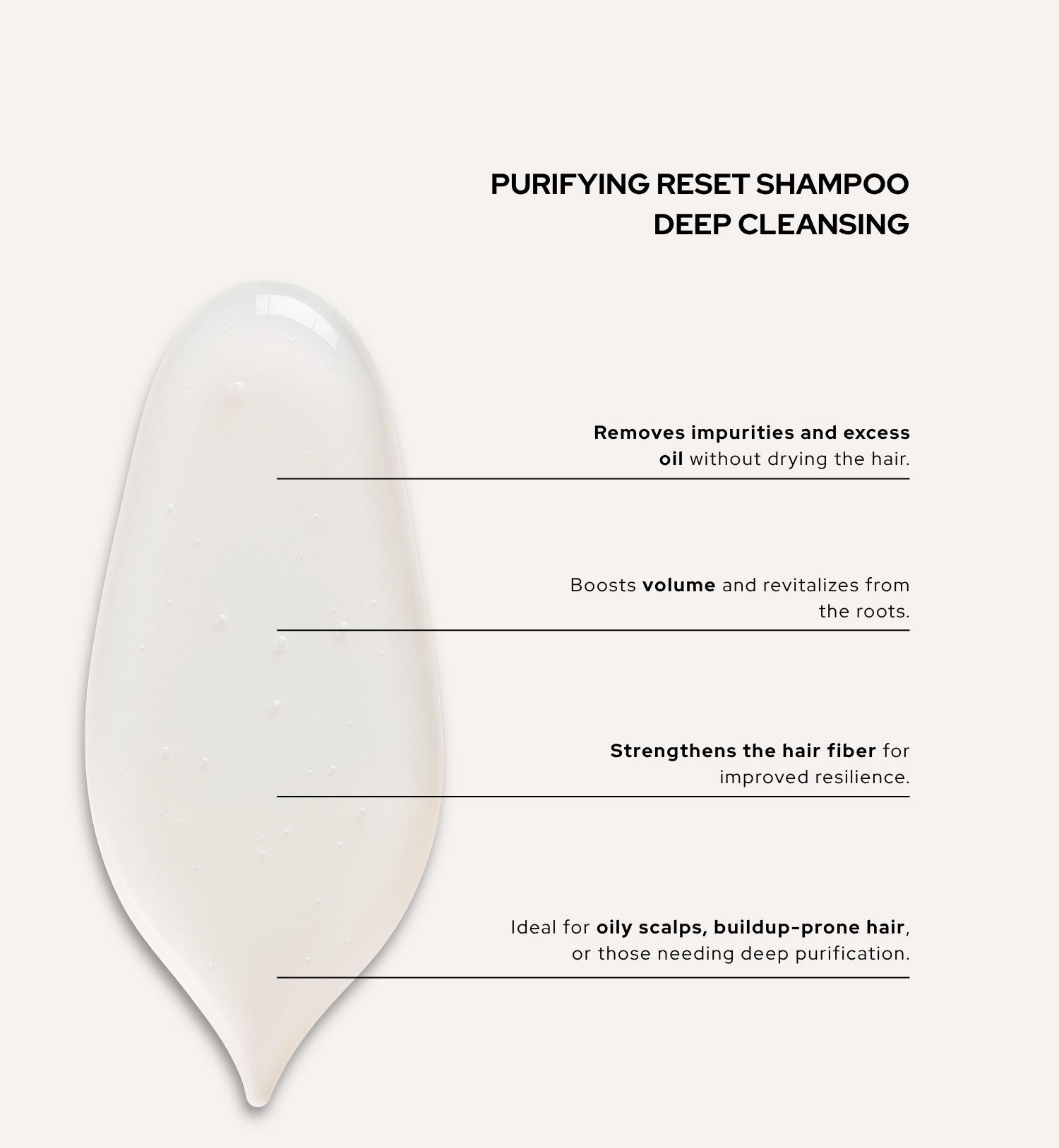 Apply PURIFYING RESET shampoo to your damp hair massaging evenly. Let it act for up to 3 to 5 minutes. Rinse it completely and repeat the process.