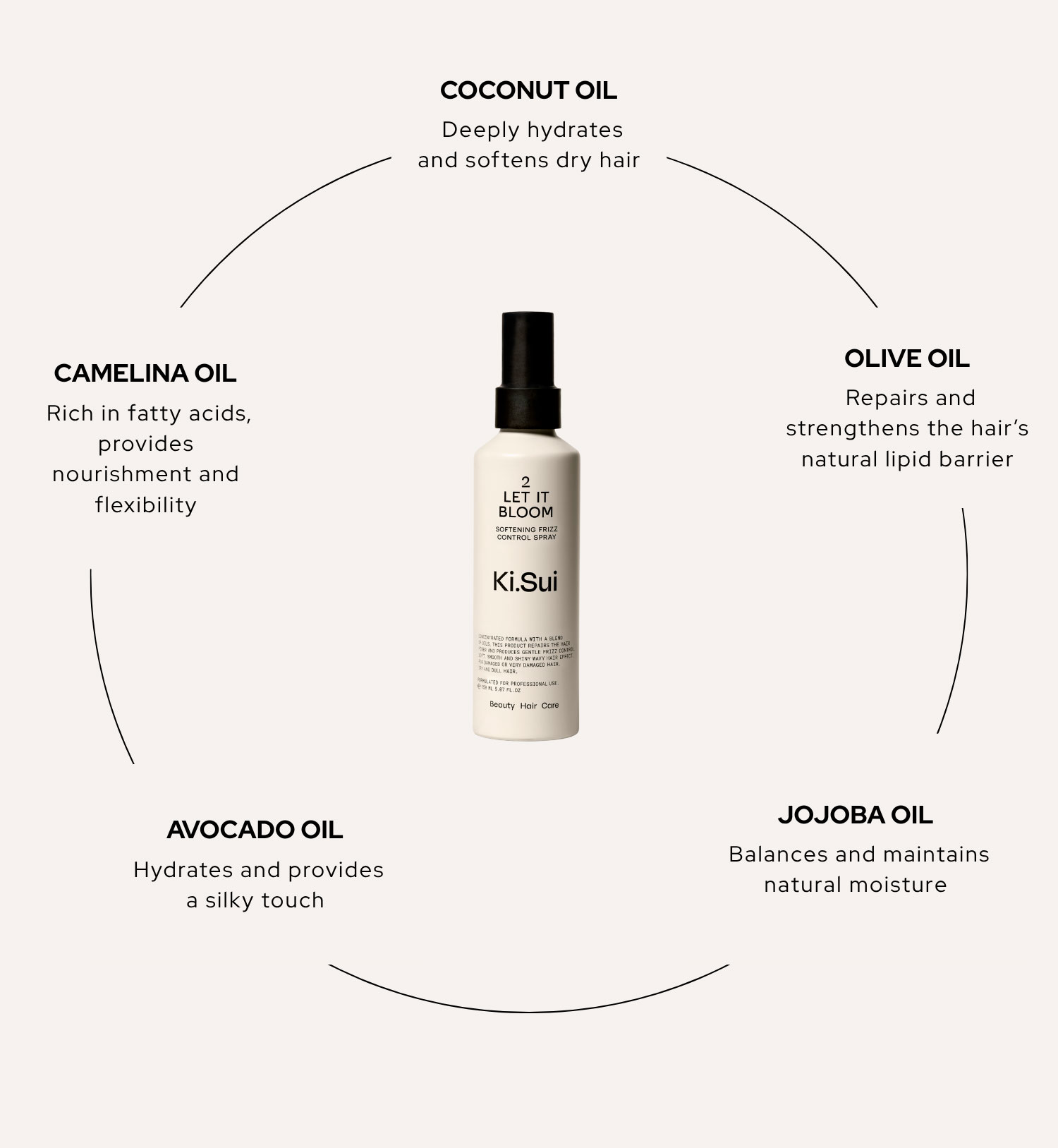 Coconut, Avocado, Ojon, Camelina, Olive, and Jojoba Oils.
